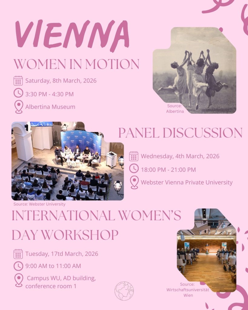 - Vienna combines cultural and academic approaches with the Albertina Museum’s Women in Motion exhibition on March 8 and Webster Vienna’s panel discussion on March 4 bringing together speakers from academia and civil society.